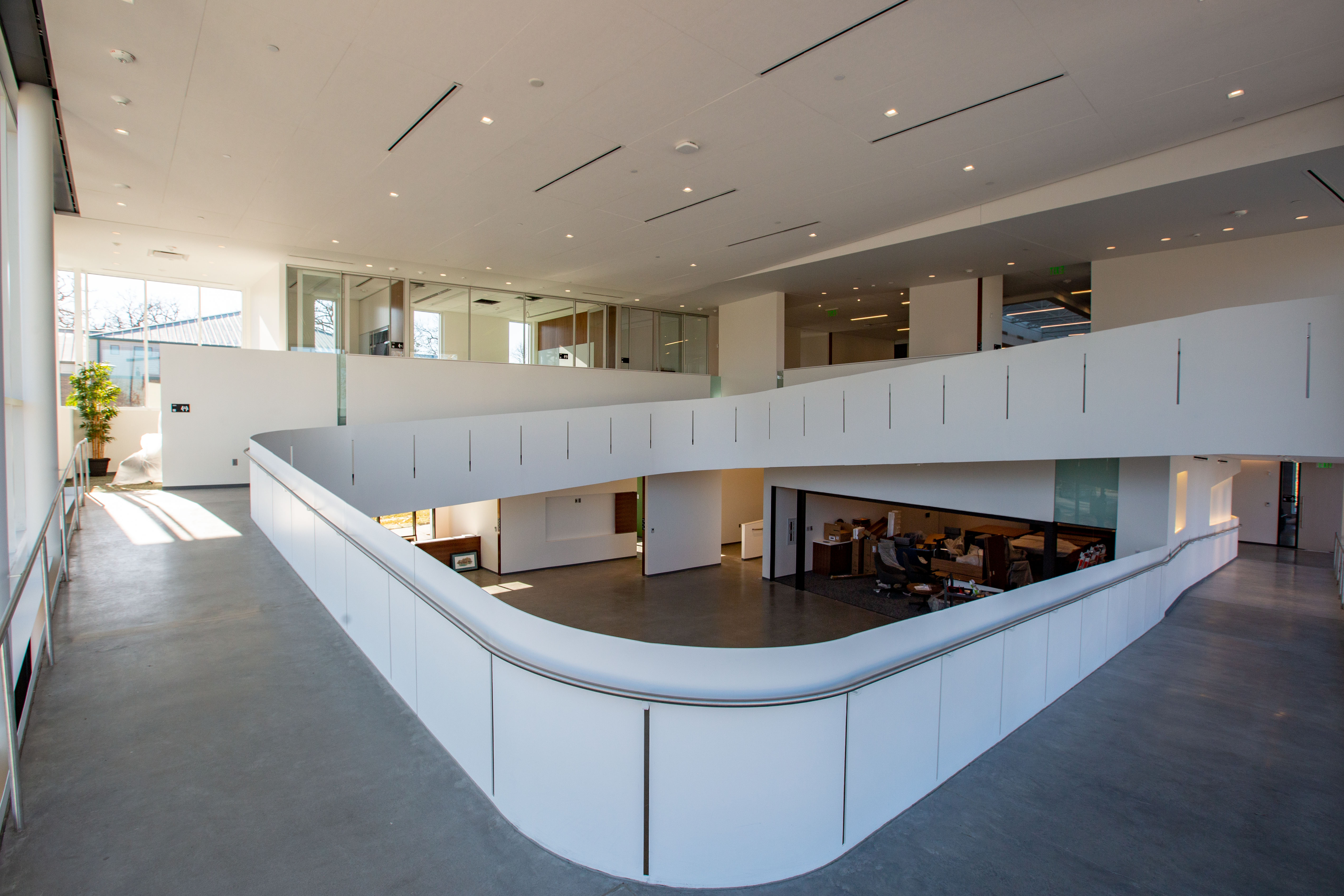A curving, continuous ramp is the centrepiece of The Tom and Ruch Harkin Center. It’s the architectural equivalent of a Welcome All sign. Described as the building’s “connective tissue,” it curves gently across two storeys, allowing all users to move through the space with dignity, not detour (it is reminiscent of the ramp at Blusson Spinal Cord Centre in Vancouver, British Columbia).